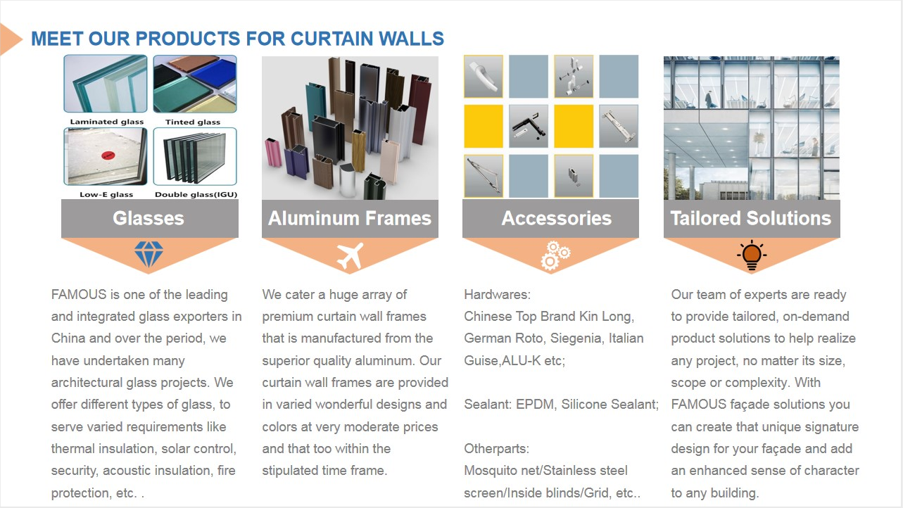 A curtain wall is a non-structural building envelope that is intended to support only its own weight and withstand the effects of environmental forces such as wind. It is not intended to support the weight of a roof or floor. Instead, gravity loads and wind resistance transfer from the surface to the building’s floor line. Since it is non-structural, it can be made of lightweight materials - glass and aluminum profiles to help reduce construction costs. We offer a variety of glass products that allows architects and designers to control every aspect of aesthetics and performance, including thermal and solar control, sound and security as well as colour, light and glare.